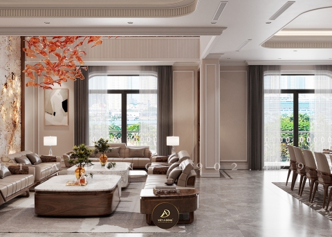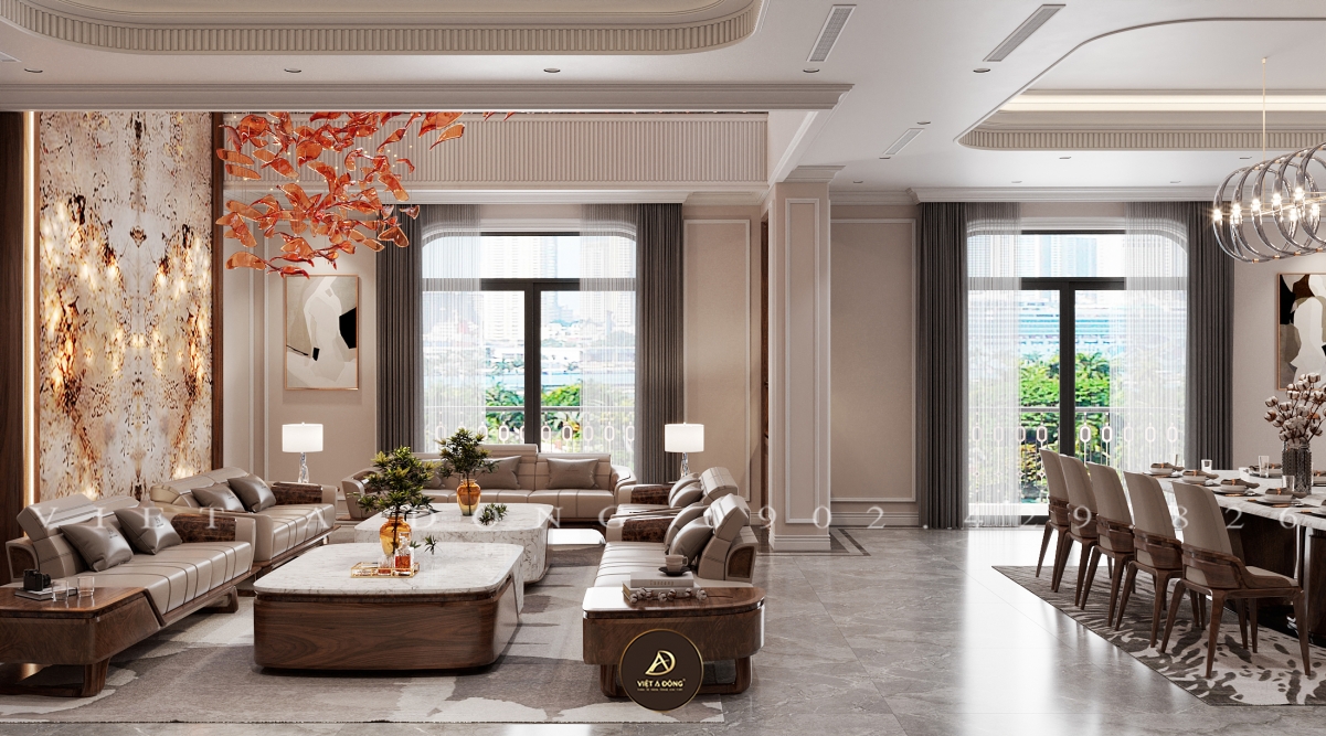 Phòng khách mở ra như một khoảng lặng giữa sự ồn ào của thế giới hiện đại, đơn giản, nhẹ nhàng nhưng cũng đủ khiến người ta phải dừng lại và ngắm nhìn. Và ở trung tâm ấy, mẫu sofa cao cấp mới nhất từ Việt Á Đông chính là điểm nhấn thị giác, nơi thẩm mỹ, chất liệu và cảm xúc gặp nhau một cách tinh tế. Được đội ngũ KTS Việt Á Đông lựa chọn kỹ lưỡng để đảm bảo hài hòa về tỷ lệ, chất liệu và phong cách, bộ sofa gỗ óc chó tự nhiên kết hợp đệm da bò Ý cao cấp không chỉ mang lại sự thoải mái mà còn khẳng định phong cách sống tinh tế của gia chủ. Hình khối mềm mại, đường nét bo cong liền lạc với thiết kế bàn trà và tổng thể nội thất, tạo nên sự gắn kết chặt chẽ trong toàn bộ không gian sinh hoạt chung.