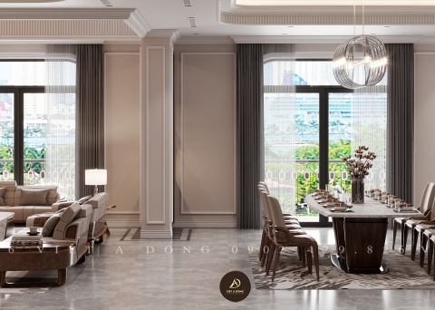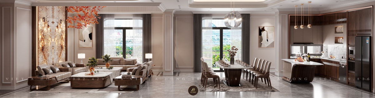 Mặt đá marble có độ bóng cao, đường vân tự nhiên và màu sắc thanh lịch không chỉ nâng tầm giá trị thị giác mà còn đảm bảo tính tiện dụng. Liền kề đảo bếp là bàn ăn đồng bộ cả về vật liệu lẫn phong cách. Bàn ăn dài 10 ghế, mặt đá trắng vân xám tinh tế, kết hợp chân bàn gỗ đặc, phù hợp với những gia đình có nhu cầu tiếp khách thường xuyên hoặc tổ chức tiệc tại gia. Đèn thả trang trí được lựa chọn kỹ lưỡng để định hình vùng không gian, tạo cảm giác ấm cúng mà không tách biệt. Đặc biệt khi kết hợp cùng nguồn sáng tự nhiên từ hệ cửa kính lớn, giúp toàn bộ khu vực ăn luôn thoáng sáng, gần gũi và giàu sức sống.