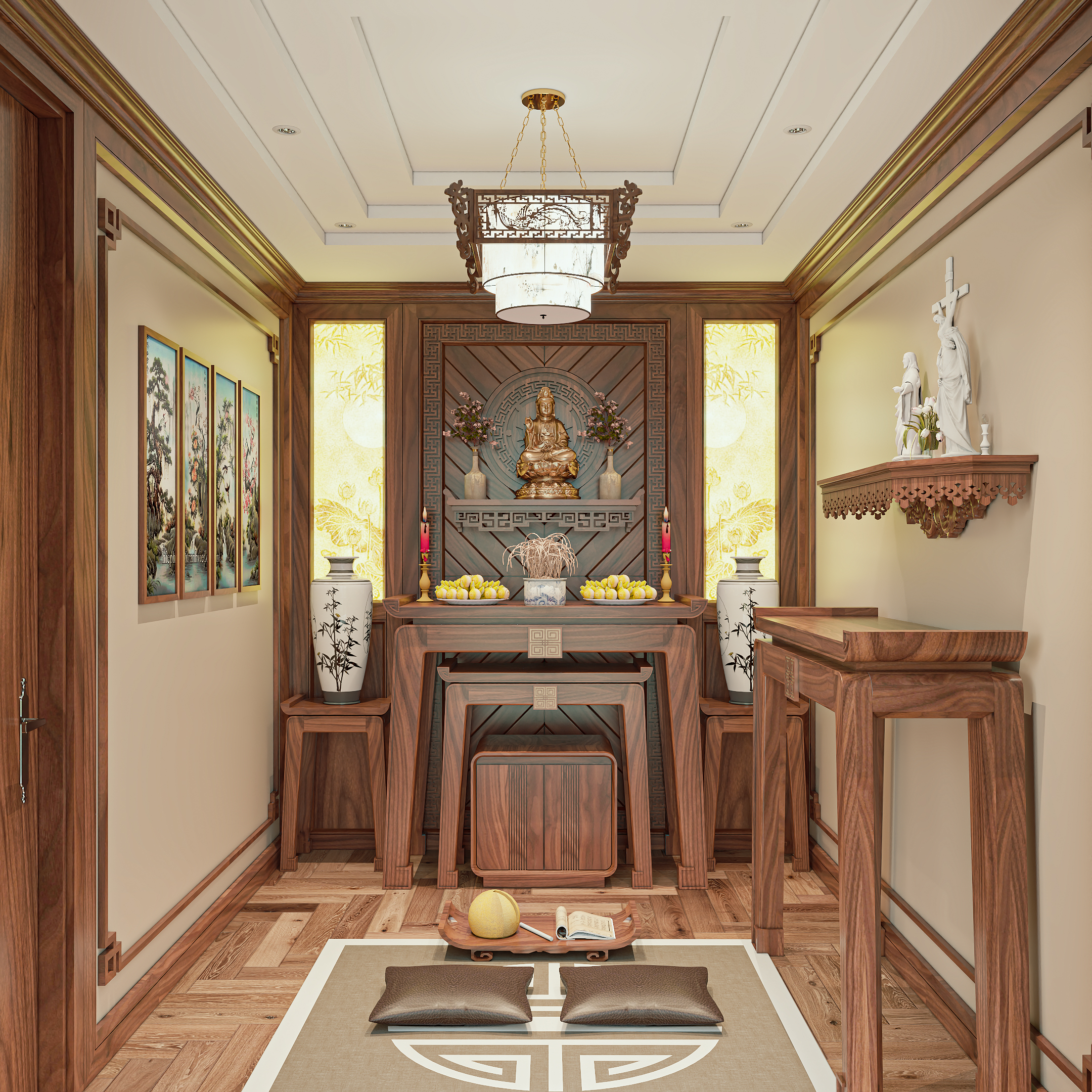 Phòng thờ được đặt ở vị trí yên tĩnh và tôn nghiêm, là không gian những giá trị tinh thần được trân trọng giữ gìn qua từng thế hệ. Cách bố trí tách biệt giữa bàn thờ Phật và bàn thờ Công giáo mang đến sự hài hòa, đủ kín đáo mà vẫn kết nối trong tổng thể chung.